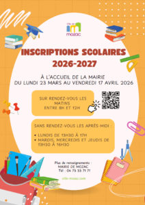 Les inscriptions scolaires pour la rentrée 2026-2027 se dérouleront à l’accueil de la mairie du lundi 23 mars au vendredi 17 avril 2026.