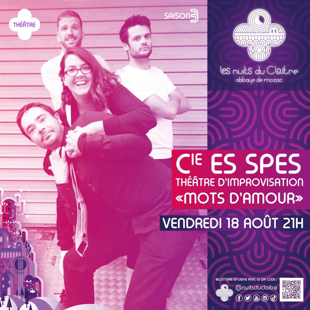 Théâtre d'improvisation avec la compagnie Es Spes dans le cadre de la saison III du festival des Nuits du cloître. Vendredi 18 août, à 21 h 00 à l'abbaye de Mozac. Tarif unique : 5€ https://www.helloasso.com/associations/les-nuits-du-cloitre-abbaye-de-mozac